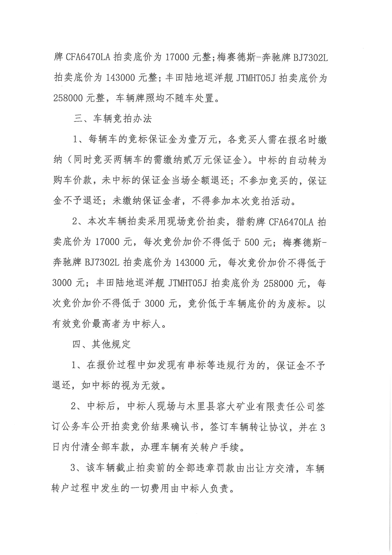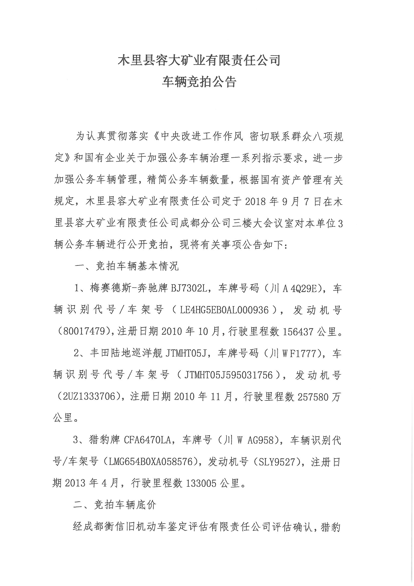 木里容大礦業(yè)關(guān)于以公開競拍方式處置車輛的公告